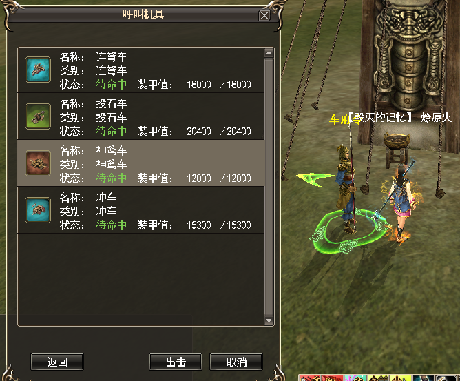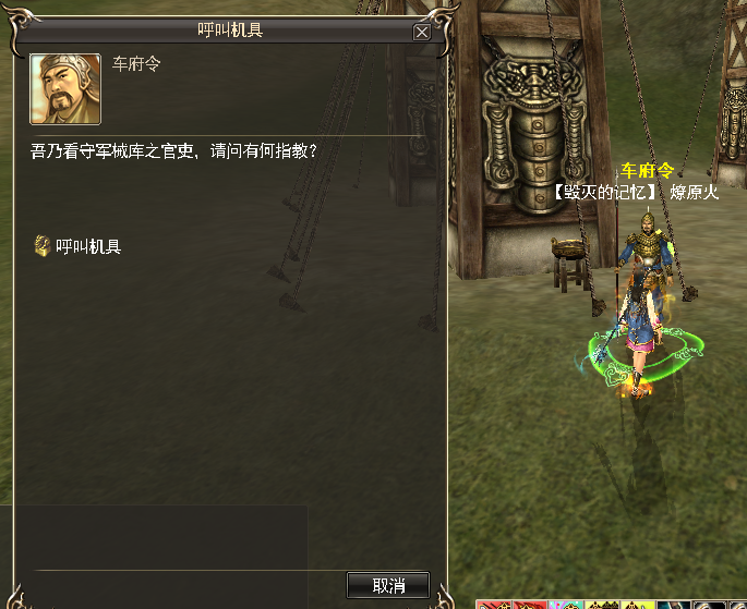 1. 陆战机具可在本方势力城池、据点、港口外的军械库向NPC【车府令】对话呼叫机具。
