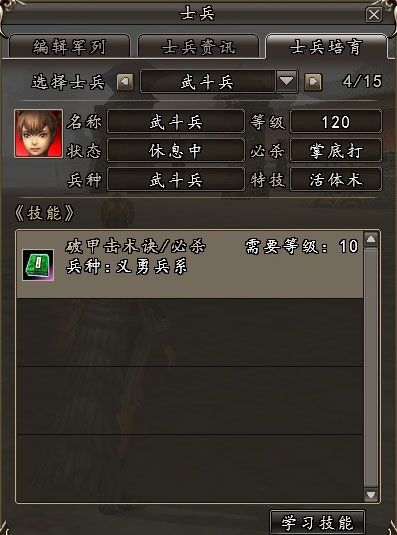 进入【士兵栏】里的【士兵培养】界面,进行士兵技能学习。