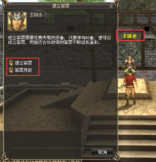 步骤一: 与各城池中的【卫尉丞】对话,并选择申请建立军团