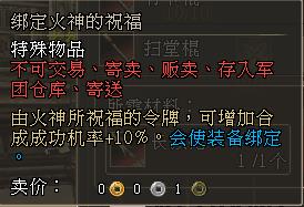 本游戏增加了绑定三火道具,即绑定火神的祝福、绑定火神防爆符以及绑定火神守护符。绑定三火不能在游戏