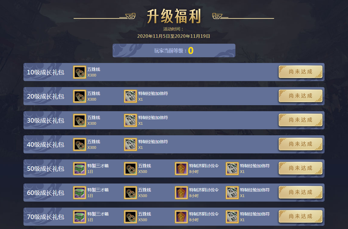 【升级福利】——活动期间内,玩家角色等级达到对应档位,即可领取相应礼包